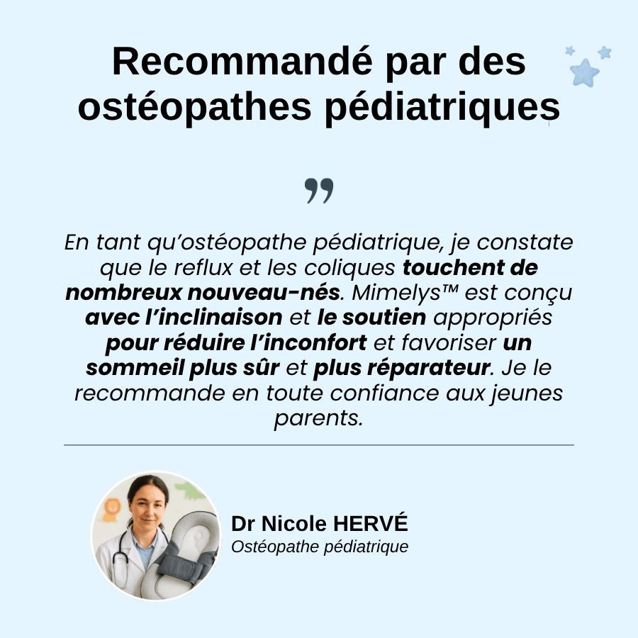 “En tant qu’ostéopathe pédiatrique, j’ai traité d’innombrables nourrissons souffrant de reflux, de mauvais sommeil et de signes précoces de tête plate positionnelle. Ce que j’apprécie avec ce lit pour bébé, c’est qu’il prend en compte ces trois aspects tout en favorisant une posture de sommeil plus sûre. Son inclinaison de soutien, son appui-tête profilé et son design anti-roulement travaillent ensemble pour réduire les risques nocturnes courants tels que l’étouffement, la suffocation et les retournements accidentels. C’est une solution intelligente pour les parents qui souhaitent offrir à leur nouveau-né un départ plus sûr et des nuits plus reposantes.” - Catherine M. - Ostéopathe pédiatrique
