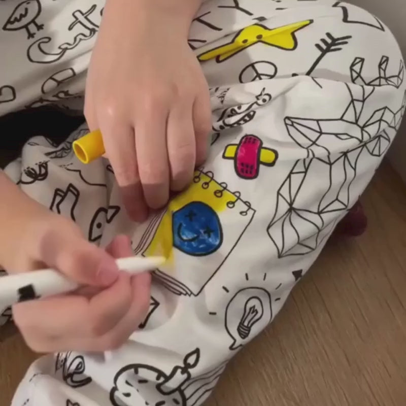 Faites plaisir à votre enfant avec un cadeau unique et écologique qui allie créativité et praticité. Transformez l’heure du coucher en un nouveau voyage artistique chaque soir grâce à nos pyjamas à colorier, lavables et réutilisables !